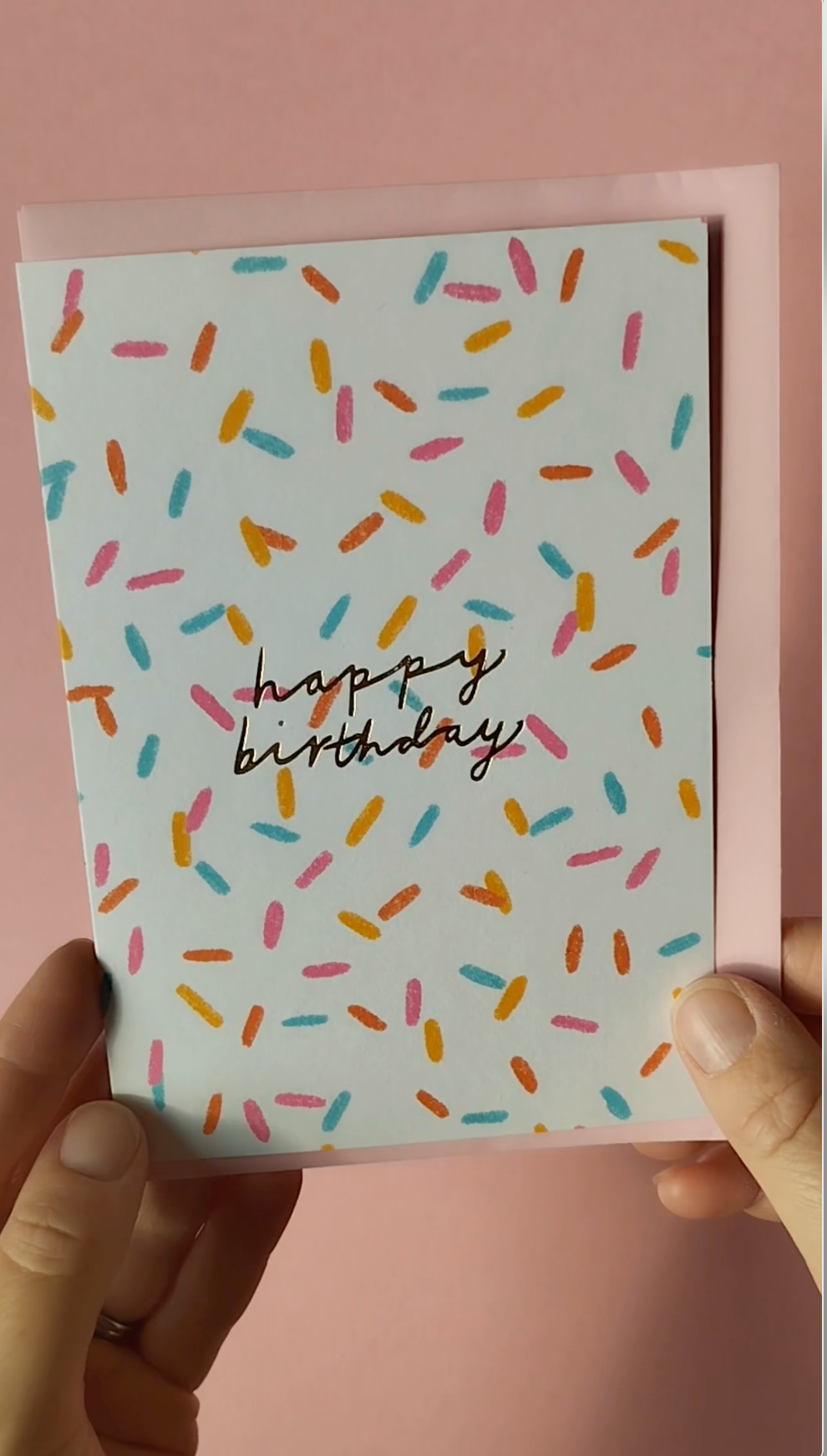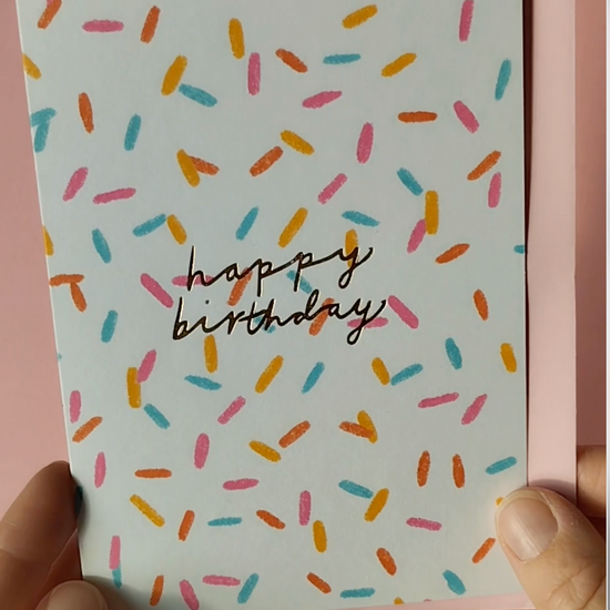 This cute sprinkles birthday card has been designed on my ipad and printed on A6 quality 300gsm card stock with a matt finish, the card has been hand foiled using my very own hot foil machine with the hand written message 'Happy Birthday' this adds a luxury detail and a super shiny extra special finish, to a simple but cute design