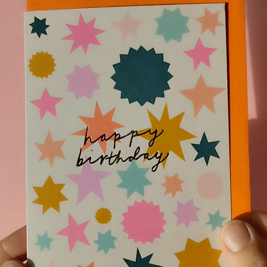 This birthday card has been designed on my ipad and printed on A6 quality 300gsm card stock with a matt finish, the card has been hand foiled using my very own hot foil machine with the hand written message 'Happy Birthday' this adds a luxury detail and a super shiny extra special finish, to a simple but stylish design