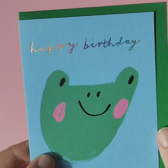 This cute frog birthday card has been designed on my ipad and printed on A6 quality 300gsm card stock with a matt finish, the card has been hand foiled using my very own hot foil machine with the hand written message 'Happy Birthday' this adds a luxury detail and a super shiny extra special finish, to a simple but cute frog illustration