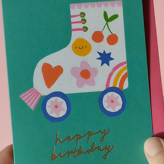 This birthday card is perfect for anyone who loves Roller skating, it has been designed on my ipad and printed on A6 quality 300gsm card stock with a matt finish, the card has been hand foiled using my very own hot foil machine with the hand written message 'Happy Birthday' this adds a luxury detail and a super shiny extra special finish, to a simple but cute design